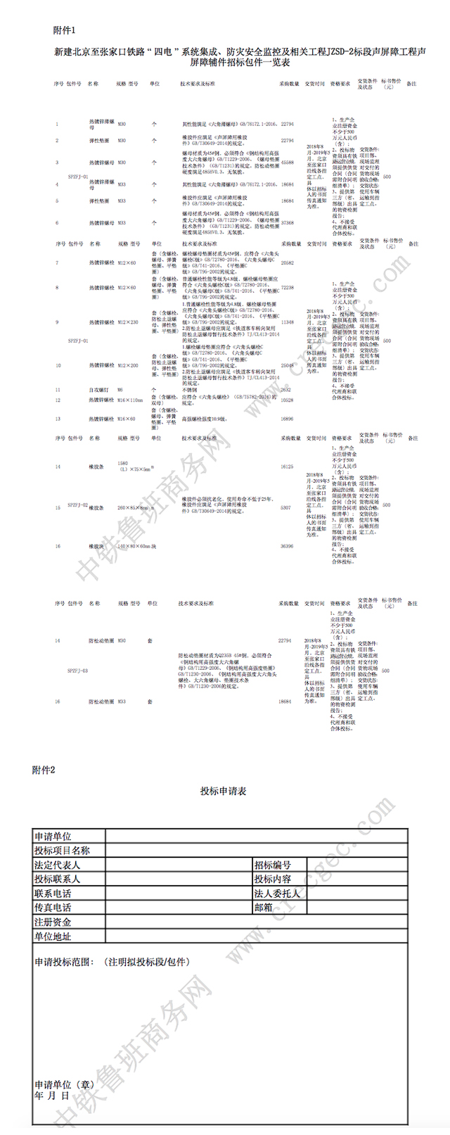 新建北京至张家口铁路“四电”系统集成、防灾安全监控及相关工程JZSD-2标段声屏障工程声屏障辅件物资(第二批)采购招标公告 招标编号:JZSPZ-WZZB-201802 1. 招标条件 本招标项目新建北京至张家口铁路“四电”系统集成、防灾安全监控及相关工程JZSD-2标段声屏障工程己由中国铁路总公司《关于新建北京至至张家口铁路初步设计的批复》(铁总鉴函(2015)1351号):《中国铁路总公司河北省人民政府关于新建崇礼下花园比站至太子城站段初步设计的批复》(铁总鉴函[20161399号)批准建设,项目业主为京张城际铁路有限责任公司,建设资金已落实,招标人为中铁电气工业有限公司京张声屏障项目部。 本项目声屏障辅件已具备招标条件,现进行公开招标。 2. 项目概况与招标内容 2.1 项目概况 新建北京至张家口铁路位于北京市西北、河北省北部,本线起自北京北站,经北京市海淀区、昌平区、延庆区,跨官厅水库,河北省怀来县、下花园区、宣化区,西迄张家口南站。新建正线全长173.964km,其中北京市境内70.503km,河北省境内103.461km。路基长59.458km,占线路长34.8%;桥梁总长65.905km,占比37.88%,隧道总长48.780km,桥隧总长114.685km,桥隧比例为65.9%。全线共设10个车站,分别为北京北、清河、沙河、昌平、八达岭长城站(地下站)、东花园北、怀来、下花园北、宣化北、张家口南。 新建北京至张家口铁路“四电”系统集成、防灾安全监控及相关工程JZSD-2标段声屏障工程位于新建北京至张家口铁路正线以及延庆支线改造工程、北京配套改建工程范围内,施工图对全线城区以及沿线村镇敏感点共设置声屏障67处。 工期目标。 计划总工期12个月; 计划开工日期2018年5月26日; 计划竣工日期2019年5月31日。 2.2招标内容 物资品种、包件划分等详见附件1《新建北京至张家口铁路“四电”系统集成、防灾安全监控及相关工程JZSD-2标段声屏障工程声屏障辅件招标包件一览表》。 3. 投标人资格要求 3.1本次招标对投标人资格的基本要求: (1)、在中华人民共和国境内依法注册、并符合投标项目经营范围、具有招标物资生产供应能力、具有法人资格能独立承担民事责任的法人组织; (2)、投标物资的生产企业必须具有有效的ISO9000或GB/T19000质量管理体系认证证书;其产品近三年内没有发生过重大质量责任事故; (3)、投标人应提供近两年经过注册会计师事务所出具的审计报告; (4)、投标物资如属于国家颁布生产许可证范围内的,应提供《全国工业产品生产许可证》;如属于行政许可或强制认证的,应提供行政许可或强制认证证书;如属于中铁检验认证中心(原中铁铁路产品认证中心)认证目录范围内的须提供相关证明文件。 (5)、投标人应有良好的履约能力和信誉;本次招标不接受中国铁路总公司(原铁道部)工程管理中心和中铁电气化局集团有限公司公布的限制投标的供应商。 (6)、法定代表人为同一个人的两个及两个以上法人,母公司、全资子公司及其控股公司,都不得在同一包件招标中同时投标。一个制造商对同一品牌同一型号的货物,在同一包件中仅能委托一个代理商参加投标,制造商和其代理商不能参加同一包件投标; (7)本次招标物资一包一投。 (8)本次招标采取“兼投不可兼中”原则,最多只能中一个包件。 3.2本次招标对投标人的专项资格要求和业绩要求,详见附件1《新建北京至张家口铁路“四电”系统集成、防灾安全监控及相关工程JZSD-2标段声屏障工程声屏障辅件招标包件一览表》。 3.3除公告明确不接受联合体或代理商投标外,其余均可接受联合体或代理商投标。 3.4招标产品随每次供货需要提供合格产品的材质单、合格证及货物到达现场后直接进行现场检测并出具第三方的检测报告。 4. 招标文件的获取 4.1本次招标文件采用电子版方式及线下发售,潜在投标人购买电子招标文件须在中国中铁采购电子商务平台(http:// www.crecgec.com /)进行供应商注册(注册联系:客服热线4006-010100)。 4.1.2潜在投标人在线下购买招标文件时间、地点:请凭本招标公告于北京时间2018年7月31日(上午9:00-12:00,下午1:30-5:00)前到中铁电气工业有限公司京张声屏障项目部(北京市昌平区百善镇百善派出所往西20米院内)购买招标文件(具体价格参照附件1中标书售价,售后不退。) 4.2凡有意参加的潜在投标人,请于2018年7月31日17:00时前将填写完整的《投标申请表》(见附件2)加盖公章后电传我部(010-61796260),1469907548@qq.com。 发售招标文件时间:2018年7月27日至2018年7月31日。 投标人根据所购买包件售价,将标书款足额汇至招标人指定账户(如下)。本单位收到汇款信息并经核实后,通知投标人在中国中铁采购电子商务平台(http:// www.crecgec.com /)下载电子版招标文件。 标书费采用汇款形式收取,标书款请电汇至: 开户名称:中铁电气工业有限公司 帐 号:3454 6754 5737 开户银行:中国银行北京芳星园支行 投标人须在备注中注明京张声屏障辅件标书费;投标人须在汇款凭证上注明招标编号及包件号。 4.3每份招标文件售后不退。 5. 投标文件的递交 5.1投标文件递交的时间为:2018年8月20日 8 时 30 分至 10时 00分,递交投标文件的截止时间(投标截止时间,下同)为 2018年8月20日 10 时 00 分,递交地点:北京市丰台区金家村288号华信大厦综合楼6楼会议室。 5.2.逾期送达的或者未送达指定地点的投标文件,招标人不予受理。 5.3本次招标采用中国中铁采购电子商务平